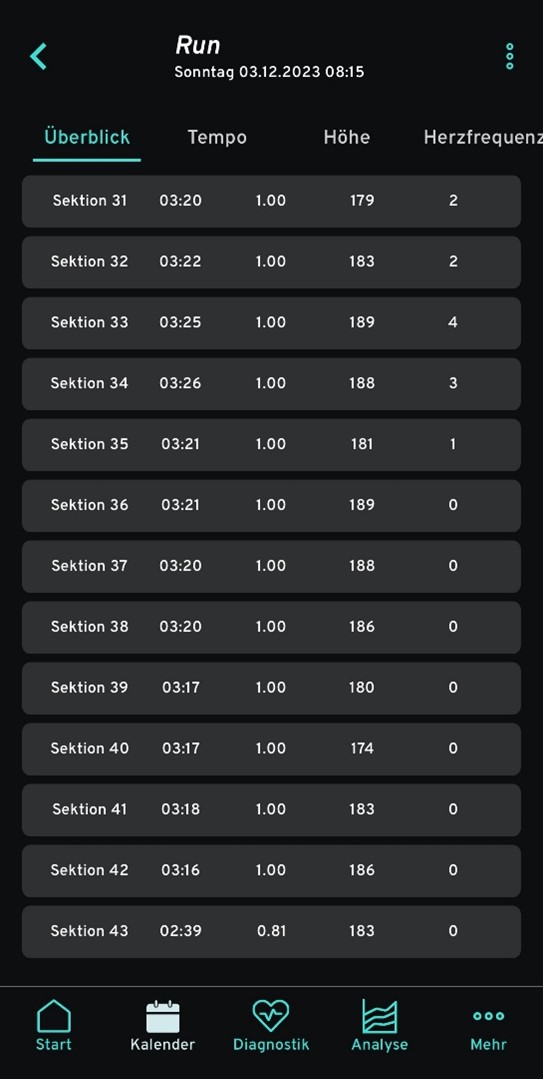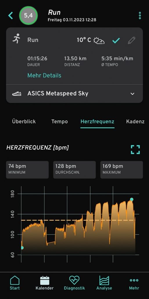 Wir führen die Leistungsdiagnostik in 1200 m Stufen durch. Gestartet wird bei 11,5 km/h und die Geschwindigkeit steigt um 1,5 km/h pro Stufe an. Nach jeder Stufe nimmt mein Vater am Ohrläppchen Blut ab, um damit mit dem Laboranalysesgerät die Laktat- und Glukosekonzentration sofort zu bestimmen. Den Test führen wir entweder als Feldtest auf der Laufbahn oder auf einem geeichten Laufband mit 0,5% Steigung durch. Kontinuierlich wird die Herzfrequenz mit dem H10 Brustgurt (Polar) aufgezeichnet. In der Abbildung 1 aus der MATS APP ist die Leistungsdiagnostik vom 03.11.2023 dargestellt. Zu sehen sind die Stufen 11,5 km/h, 13 km/h, 14,5 km/h, 16 km/h und 17,5 km/h was einer Pace von 3:26 min/km entspricht und einer Marathonzeit von sub 2:26:50 h. Da die Laktatkonzentration mit 2,3 mmol/l im Bereich der anaeroben Schwelle lag, haben wir diese Stufe dann jeweils fünfmal wiederholt. So können wir beobachten, wie und ob Laktat, Glukose und Herzfrequenz bei Racepace weiter ansteigen. Idealerweise bleiben diese Werte konstant, ansonsten ist die Marathon Racepace zu hoch gewählt. Am 03.11 blieben die Laktatwerte weitgehend konstant, sodass wir am nächsten Morgen mit dem zweiten Teil der „Key Session“ starteten. Ein Tempodauerlauf bei 3:26 min/km für 30 min, gefolgt von einer 10 minütigen Temposteigerung auf 3:20 min/km. Der Herzfrequenzverlauf in der MATS APP ist in Abbildung 2 dargestellt. Zu erkennen ist ein Heartrate Drift in den ersten 30 Minuten von ca. 10 Schlägen/min, was unseren Erwartungen entspricht. Die Laktatkonzentration nach dieser 40 minütigen Einheit war unter 3 mmol/l. Eine regelmäßige Überprüfung mittels der Leistungsdiagnostik von langsamer bis zur Wettkampfgeschwindigkeit hilft uns, die aerobe und anaerobe Schwelle und die damit einhergehenden Herzfrequenztrainingszonen fortwährend im Trainingsprozess zu aktualisieren.