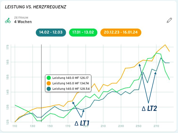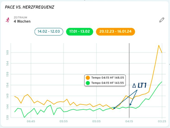 In dieser Analyse ist es mir möglich die Verschiebung der ersten Laktatschwelle abzuleiten und Rückschlüsse aus dem Training zu ziehen, da die Herzfrequenz eine Reaktion auf den erhöhten metabolischen Umsatz widerspiegelt. Dies ermöglicht es mir das LIT-Training sowie das Training im Bereich des Fatmax sehr simpel zu definieren, da das Fatmax mit dem ersten Laktatanstieg in enger Beziehung steht.